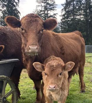 Pippin is actually the calf in this photo. Our last calf by Mrald Absolutely Perfect out of Rusty's Hot Cider. We successfully showed Pippin her yearling year and she has joined our brood cow string.